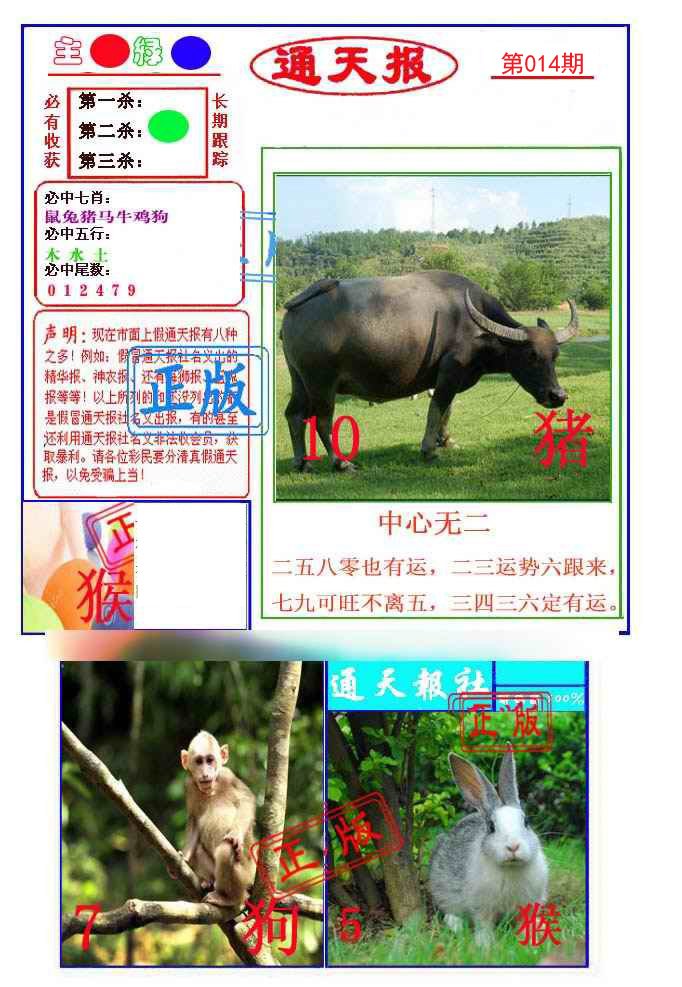| 012期: ⑨肖 | 羊猪鸡兔鼠猴马蛇狗 | 兔15中 |