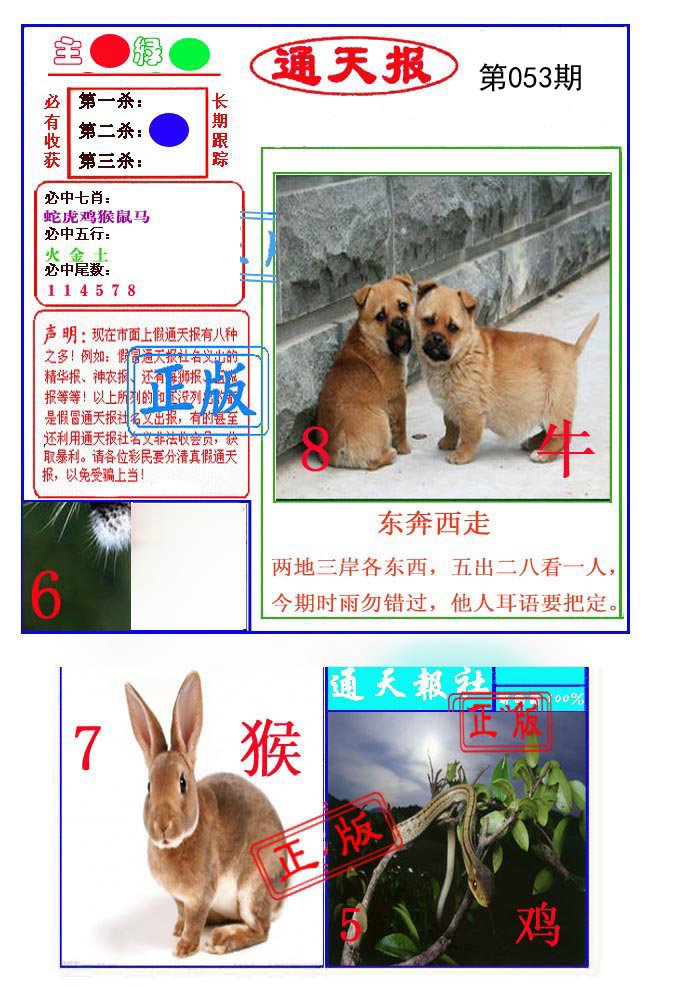 | 051期: ⑧肖 | 鸡蛇猪龙鼠兔牛羊 | 虎05中 |
