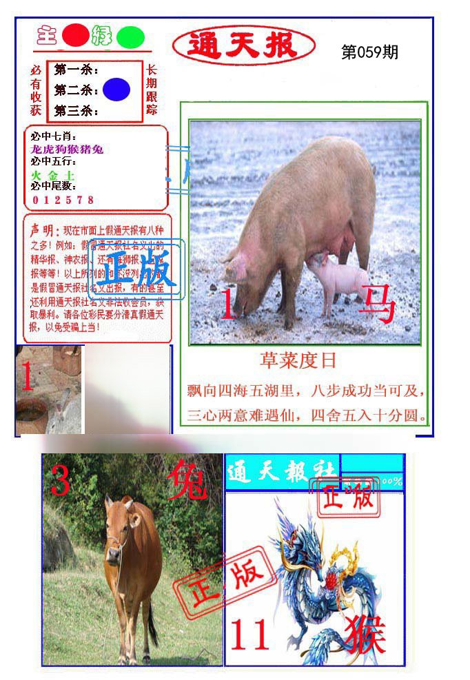 | 059期: ⑥肖 | 牛狗猪猴鼠龙 | 猪20中 |