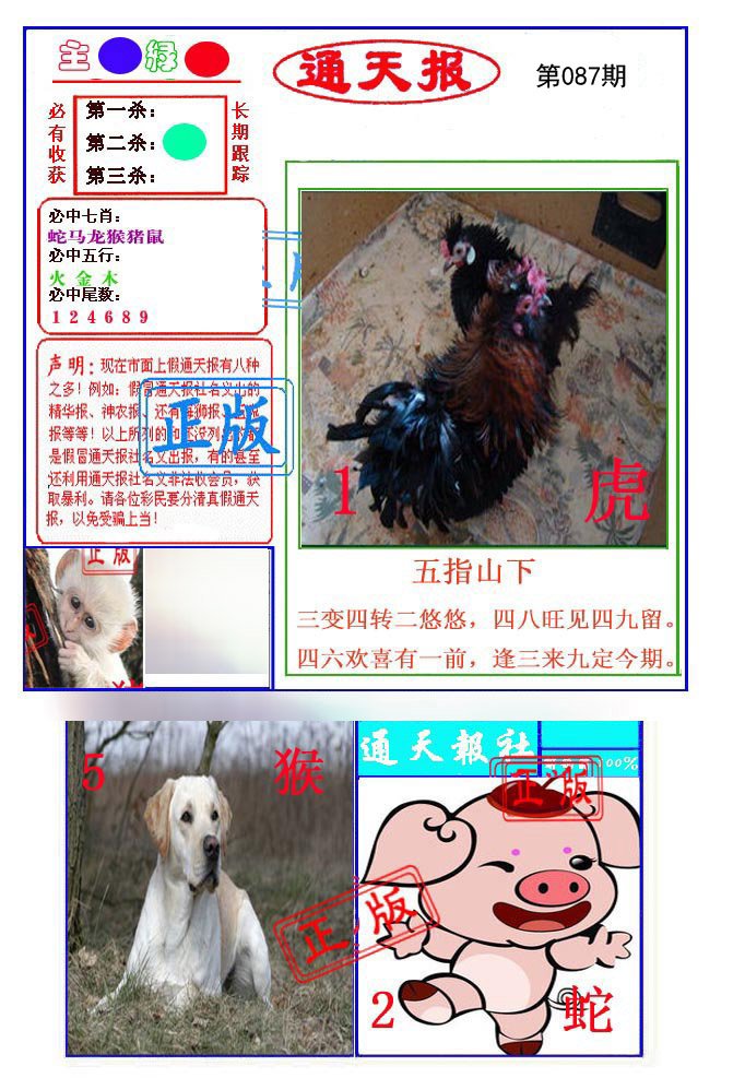 | 087期: ⑤肖 | 鸡猴虎狗马 | ????中 |