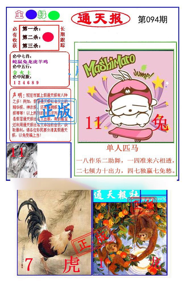 | 087期: ⑨肖 | 鸡猴虎狗马猪牛羊鼠 | 猴11中 |