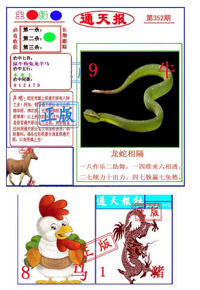 | 352期: ⑨肖 | 蛇兔虎猪狗猴鼠马鸡 | ????中 |