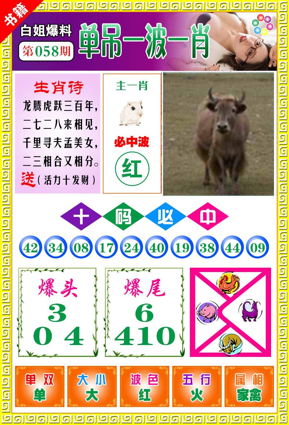 | 058期: ⑨肖 | 虎鼠牛龙马鸡猴兔猪 | 羊24中 |