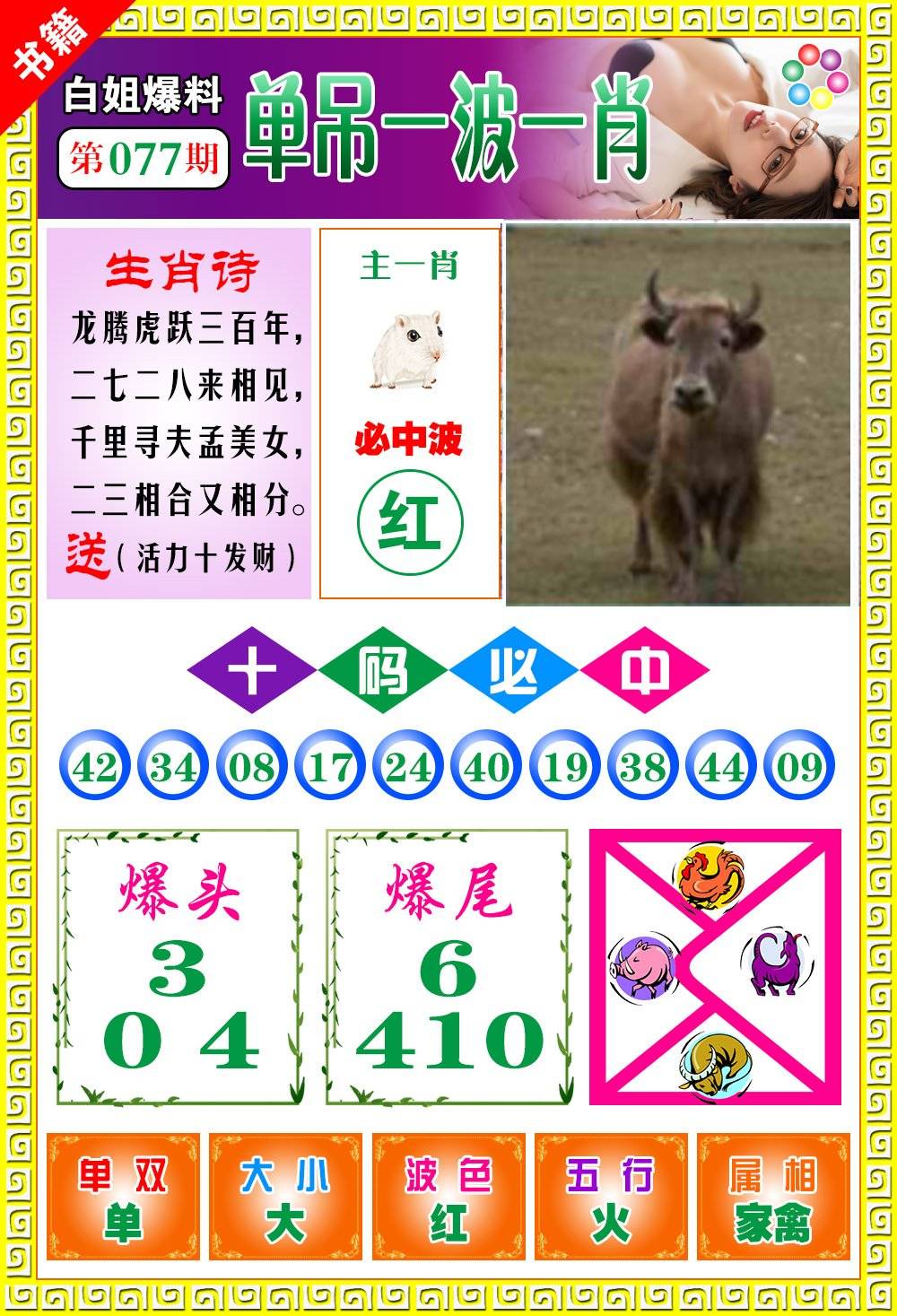 | 073期: ⑨肖 | 猪兔蛇牛羊狗鼠马猴 | 牛18中 |