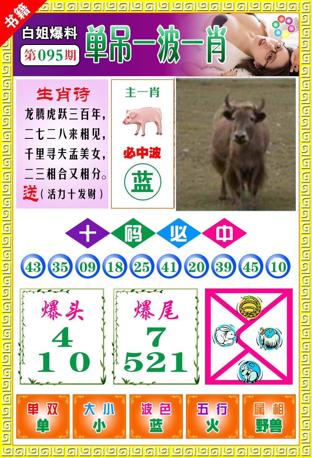 | 095期: ⑨肖 | 蛇牛狗鼠羊龙马猴虎 | 羊12中 |