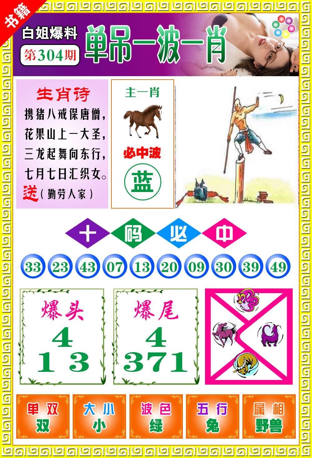 | 304期: ⑦肖 | 龙虎羊狗猴蛇马 | 兔03中 |
