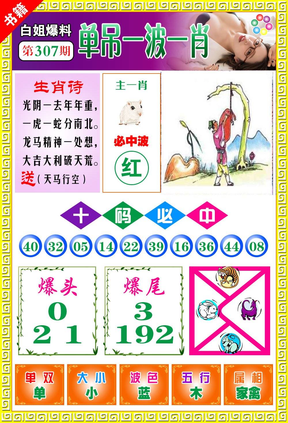 | 307期: ⑨肖 | 鸡蛇兔羊虎猴马鼠牛 | 马36中 |